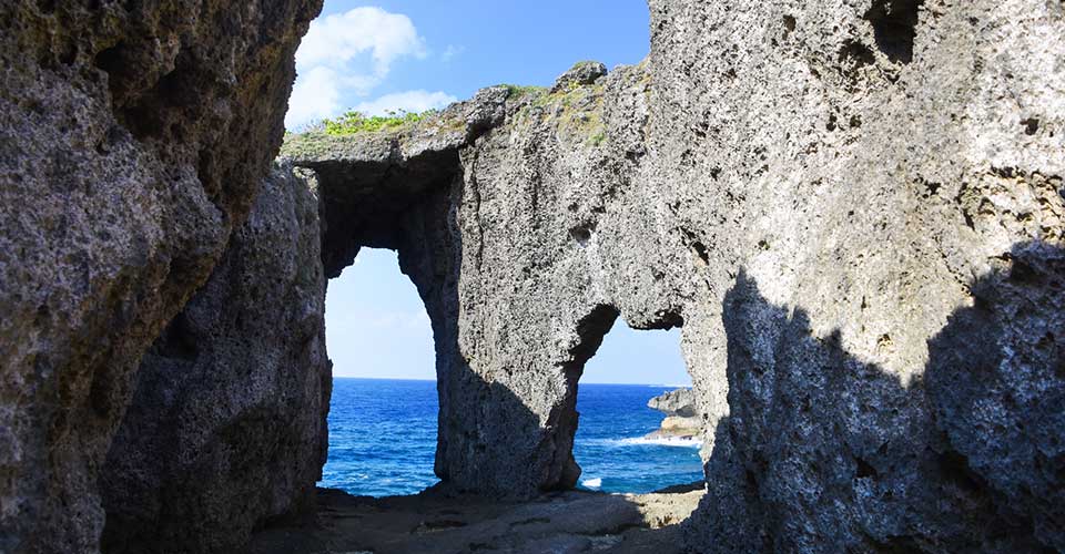 隆起サンゴ礁が季節風や荒波によって浸食され出来た奇岩や断崖が点在する海岸。通称「めがね岩」と呼ばれる穴の開いた岩は、その穴から望む空と海の景色が美しく、おすすめの撮影スポットです。