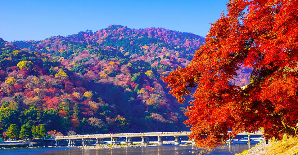 京都を代表する紅葉の名所嵐山は、渡月橋の西にそびえる標高381.5mの山で、国の史跡名勝に指定されています。春は桜、秋は紅葉の名所として多くの観光客が訪れます。嵐山のシンボルとも言われる渡月橋は「月が橋を渡っているように見える」と、亀山上皇が唄ったことが由来とされています。渡月橋がかかる大堰川(おおいがわ)の上流、保津川に沿って走るのが「嵯峨野トロッコ列車」です。景色が美しい場所では速度を落として運転するため、嵐山の景色をゆっくりと楽しむことができます。