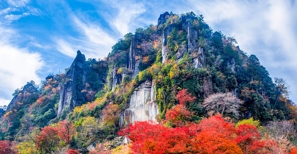 九州の紅葉スポットとして有名な大分県の耶馬溪(やばけい)は、本耶馬渓(本耶馬渓町)、裏耶馬溪・深耶馬溪(ともに耶馬溪町)、奥耶馬溪(山国町)に分かれます。耶馬渓の紅葉は、京都の嵐山、栃木の日光と並び、日本三大紅葉名所と呼ばれています。群猿山、鳶ノ巣山、嘯猿山、夫婦岩、雄鹿長尾の峰、烏帽子岩、仙人岩、海望嶺などから成る岩峰群を見渡せる景勝地「一目八景(ひとめはっけい)」からの展望は見事です。紅葉に染まる山々の風景を眺めながらのウォーキングがお勧めで、遊歩道と川と紅葉の織り成す風景を心ゆくまで堪能できます。紅葉の例年の見頃は10月下旬~11月中旬です。