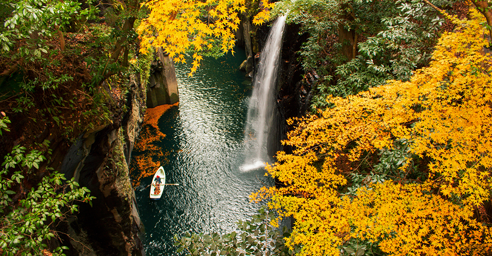高千穂峡は、宮崎県北部に位置する自然の宝庫で、紅葉の見頃は例年11月から12月にかけて。鮮やかな赤や黄の紅葉が、深い緑の渓谷と美しい対比を造り出し、幻想的な風景が広がります。特に注目すべきは、真名井の滝です。この滝は高さ約17mで、紅葉とともにその美しさが際立ちます。高千穂峡の特徴的な景観として柱状節理の断崖があります。これは溶岩が冷却固化する際に形成された六角形の柱が並ぶ独特の地形で、紅葉と相まって壮観な眺めを提供します。遊歩道を散策しながら、迫力ある滝や清らかな川の音を楽しむことができます。ボートに乗って川を下ると、また違った角度から紅葉と滝、そして柱状節理を堪能できます。高千穂峡の紅葉シーズンには多くのイベントやライトアップも行われ、夜間の紅葉も楽しむことができます。高千穂峡の紅葉は、心に残る素晴らしい秋の体験となるでしょう。