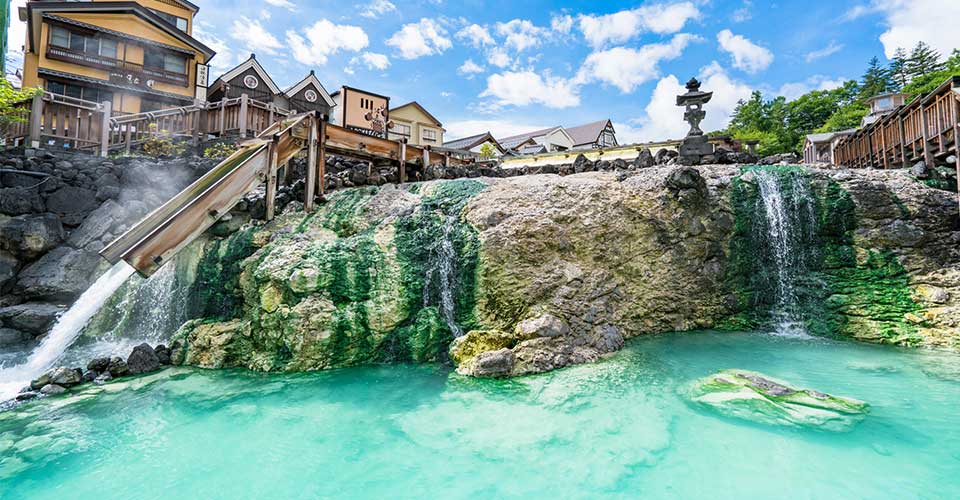 江戸時代から続く「湯もみ」で知られる草津温泉。日本でも有数の湧出量を誇り、温泉街の至る所で源泉掛け流しを堪能できます。泉質は酸性硫黄泉で殺菌力が強く、古くより「恋の病以外はなんでも治す」と称されてきました。温泉街の中心には国の文化財名勝「湯畑」があり、そこから散策を楽しめます。草津三湯(開放感抜群の「西の河原露天風呂」、かつての木造建築を再現した趣ある「御座之湯」、昔から草津に伝わる『合わせ湯』を楽しめる「大滝之湯」)をめぐるのもおすすめです。
