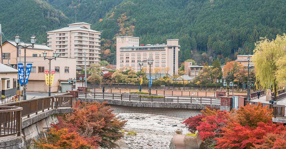 飛騨川沿いの山間にある、草津温泉・有馬温泉と並んで人気の温泉地。泉質は単純温泉(アルカリ性単純温泉)で、非常に滑らかな肌触りのお湯は「美人の湯」といわれています。人気のブランド牛「飛騨牛」をはじめ、食料の宝庫である飛騨地方の食材を使用した料理も楽しみのひとつです。温泉街の加盟店三軒に入浴できる「湯名人湯めぐり手形」で下呂温泉めぐりを楽しんだり、アクセスの良い飛騨高山への観光もおすすめです。