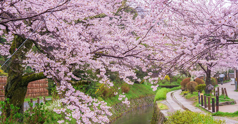 北の銀閣寺から南の若王子橋まで、琵琶湖疎水に沿った約2㎞に渡る遊歩道が「哲学の道」と呼ばれています。桜や紅葉の名所として知られ、桜の時期はソメイヨシノなど約400本の桜が訪れる人を魅了します。