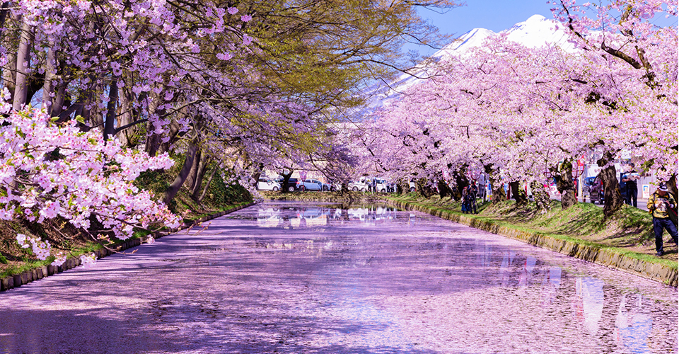 弘前公園は、弘前市の中心部に位置する、総面積約14万9000坪にも及ぶ公園です。その敷地はもともと、藩政時代に弘前藩10万石を治めた津軽家代々の居城であった、弘前城が基になっています。400年を経た今も残っている天守、3つの櫓、5つの城門は国の重要文化財に指定されており、ゴールデンウィークにはソメイヨシノや八重桜など約2600本の桜が園内を埋め尽くす日本屈指の桜の名所としても知られています。春には日本一の呼び声高い桜祭り、秋にはお濠や天守の白壁も真っ赤に染める紅葉まつり、そして冬には巨大雪像やミニかまくらも多数作られる雪灯籠まつりが催され、夏に市内を運行するねぷた祭りとあわせて、四季を通じたイベントの舞台となっています。