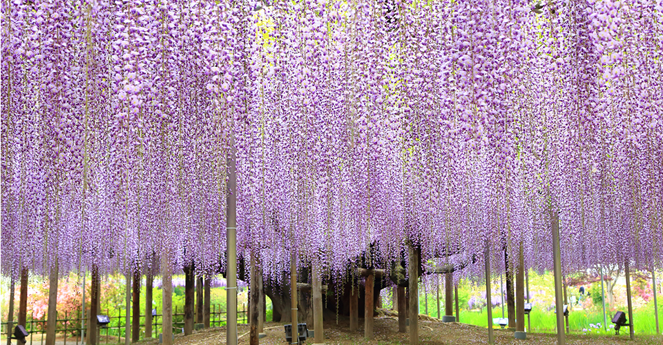 年間通じて、四季を彩る花々が咲き誇る花と光の楽園「あしかがフラワーパーク」。毎年4月中旬から約1カ月にわたり開催されるイベント「ふじのはな物語」では、樹齢160年におよぶ600畳敷きの藤棚や長さ80mの白藤のトンネルなど350本以上の藤が咲き誇ります。同時期に見頃となるクルメツツジのほか、初夏のバラ、クレマチス、シャクナゲ、ハナショウブ、夏のスイレンなども見事です。秋には2万株のアメジストセージが園内を紫色に染め上げ、冬期は日本三大イルミネーションに認定されている「光の花の庭」が開催されます。四季折々の見頃の花に合わせてイベントを開催しているので、1年間どの時季に行っても華麗に咲き誇る花々を楽しむことができます。