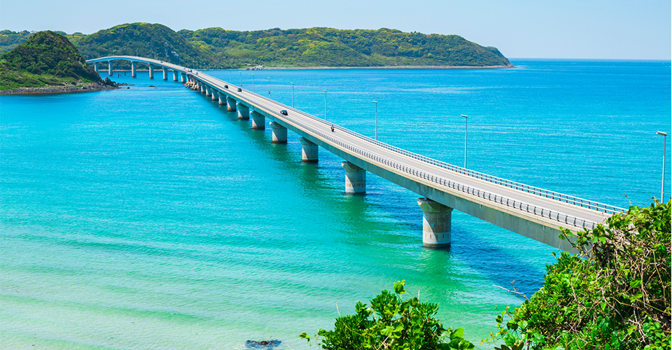 山口県下関市にある2000年に開通した本州と角島を結ぶ「角島大橋」。リゾートのような白い砂浜とコバルトブルーの海が広がる絶景からSNSでも話題となり、テレビCMやロケ地としても多く取り上げられ、またたく間に日本トップクラスの絶景ポイントとして紹介されるようになりました。橋の長さは1780mで、無料で渡れる一般道としては日本屈指の長さです。車だけでなく自転車や徒歩でも渡ることができ、海風を感じながらのサイクリングや散歩コースとしても大変おすすめです。