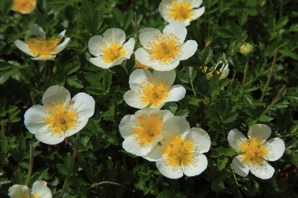 バラ科で高さ約10cm。白い5枚の花弁を持ち、清楚で美しい姿が特徴です。本州中部以北から北海道の高山帯や雪渓周辺の多湿地に生息。