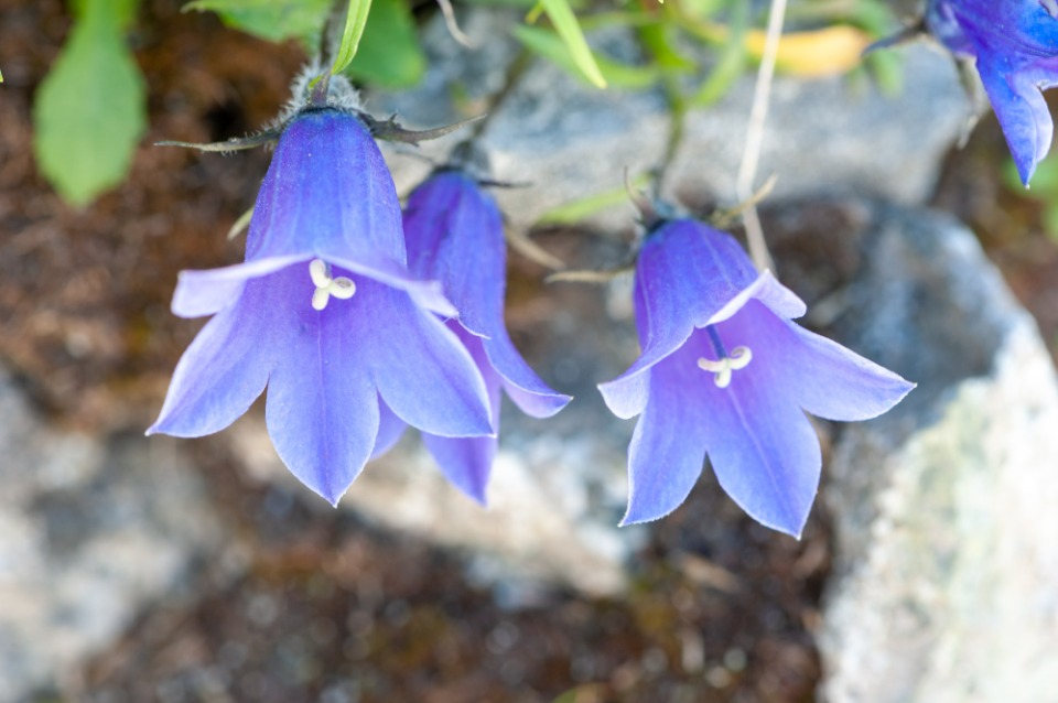 キキョウ科の多年草で青紫の釣り鐘形の花が特徴。繊細な花びらが薄い膜のように見え、岩場や砂礫地でひときわ存在感を放ちます。