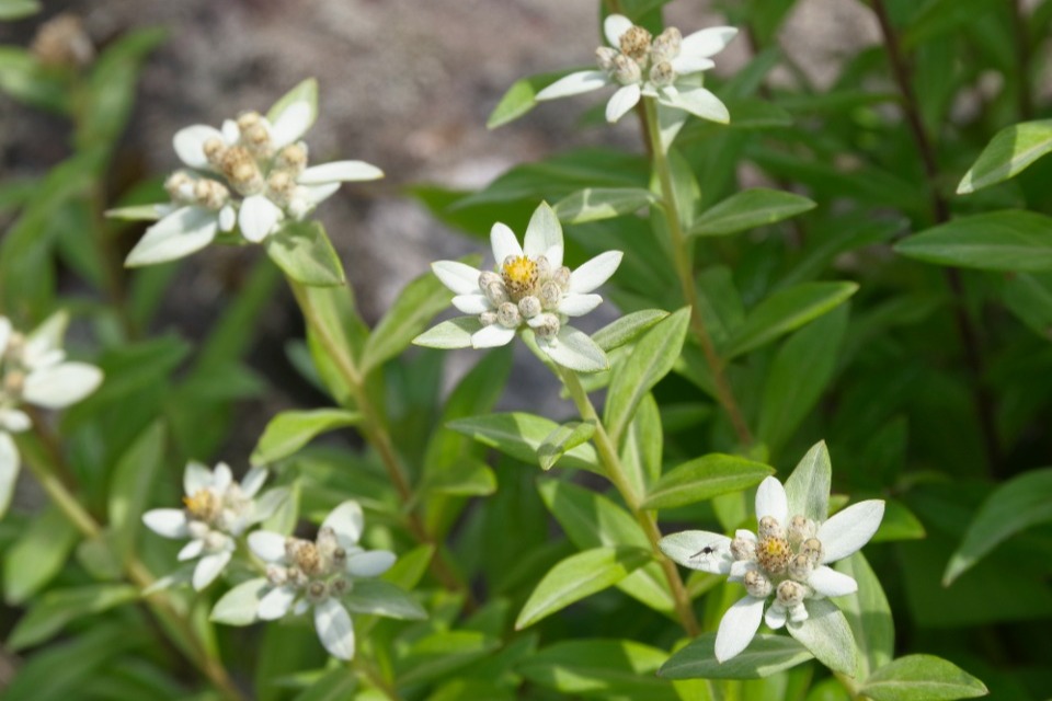 キク科の多年草で、白い毛に覆われた葉と花が雪をかぶったように見えることから名付けられました。別名「日本のエーデルワイス」