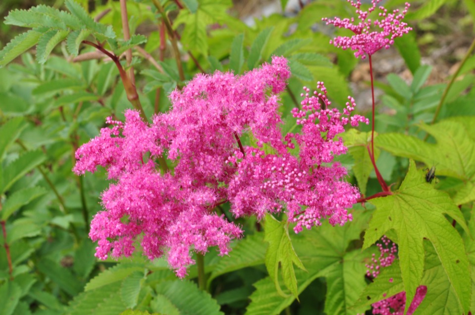 バラ科の多年草で、ピンク色の小さな花が密集して咲くのが特徴。花全体がふんわりと広がり、柔らかい印象を与えます。