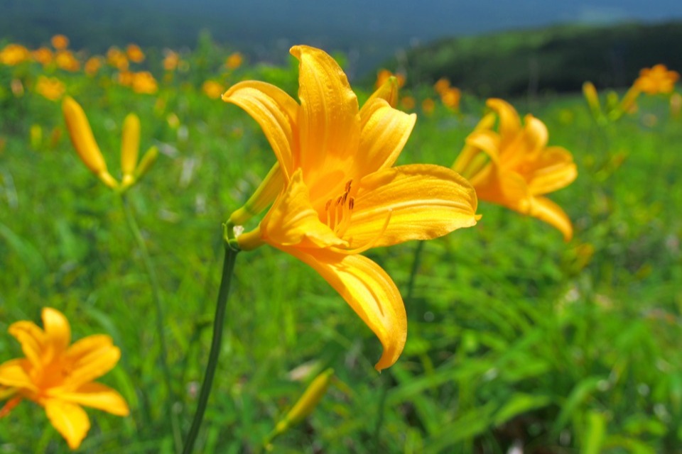 ユリ科の多年草で、大きく明るい黄色の花が目を引きます。日中に開き、夕方には閉じてしまう一日花ですが、群生する姿は圧巻です。