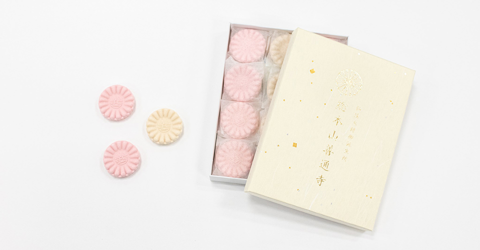 第75番札所「総本山善通寺」の寺紋は、十六枚の花弁を持つ菊の中央に「善」の文字を配した「菊に善」という独特のデザイン。善通寺に訪れたらおさえておきたいのが、この寺紋をあしらった和三盆糖。伝統を守りながら、当時と変わらぬ製法で作り続けている、純日本産の白砂糖「さぬき和三宝糖」を使って作られています。砂糖本来の上品な甘さと、独特な口溶けの良さが特徴です。