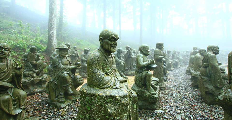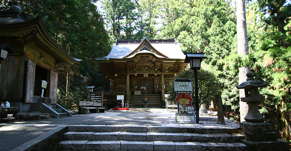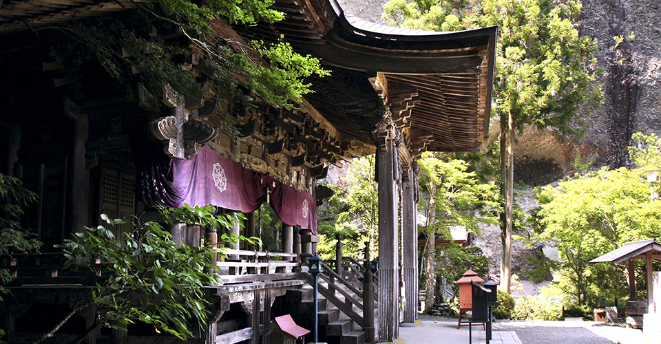 第45番札所「岩屋寺」では、仏教の教えを体感できるさまざまな体験(事前予約制)が用意されています。一つは真言宗独自の阿字観という瞑想です。自然を望む非日常的な空間で行われ、瞑想の後にはテーブル席でティータイムも楽しめます。また、心を落ち着けて或る写経や、仏像を写し描く仏の講座もあり、静寂の中で心安らかなひとときを過ごせるでしょう。標高700mの山中に位置する岩屋寺へは、急勾配の坂や石段が続く600mの参道を通って行きます。境内には、小さな本堂や西洋風の意匠を取り入れた大師堂、さらには金運や芸事にご利益があると弁財天など、多彩な参拝スポットが点在しています。