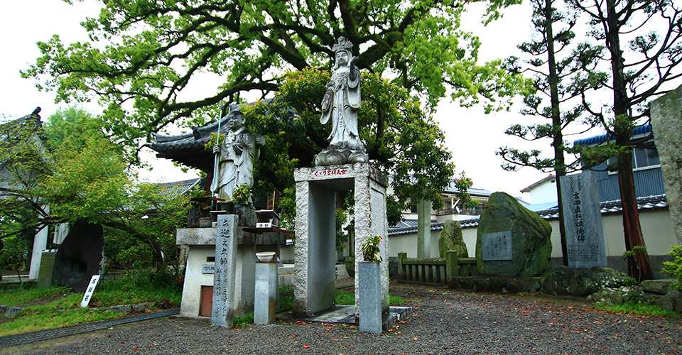 第63番札所「吉祥寺」は、四国霊場の中で唯一「毘沙門天」をご本尊とする札所です。空海が光を放つ檜から毘沙門天と吉祥天女、善膩師童子を彫像し、安置しました。毘沙門天は七福神の一員であり、四天王にも属す仏神で、商売繁盛、勝負事にご利益があるとされています。そして境内には、お迎え大師の右横に当寺の名前の由来である毘沙門天の妃、吉祥天女の像があります。像の真下をくぐると悩みや苦しみ取り除き富や良い縁が舞い込むとされ、「くぐり吉祥天女」として有名です。