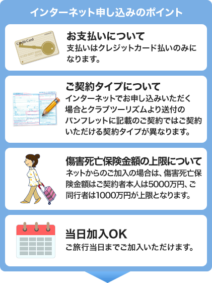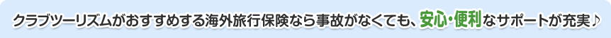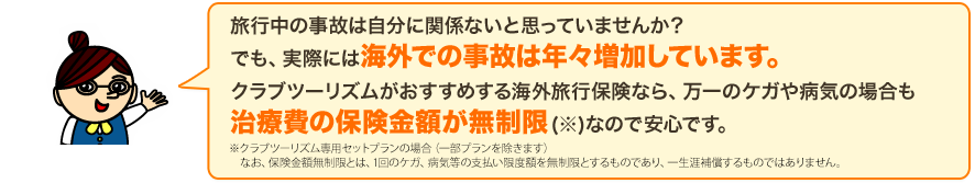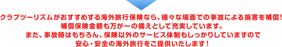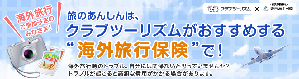 このホームページは、海外旅行保険の概要についてご紹介したものです。ご契約にあたっては、必ず「重要事項説明書」をよくご確認ください。ご不明点等がある場合はクラブツーリズムまでお問い合わせください。