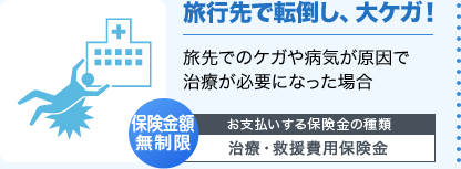 - (※2)保険期間31日までのご契約で「疾病に関する応急治療・救援費用担保特約」がセットされているご契約の場合にお支払いの対象となります。本特約の保険金のお支払い額は、1回の病気につき治療費用部分・救援費用部分合計で300万円がお支払いの限度となります。(治療・救援費用保険金額 300万円超の場合) なお、旅行日程が延長となり、31日超の保険期間に期間延長される場合、延長された期間については本特約をセットすることはできません。