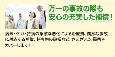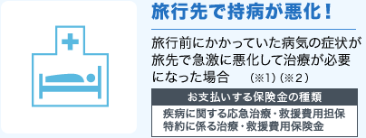 - (※1)症状の急激な悪化とは海外旅行中に生じることについて被保険者(保険の対象となる方)があらかじめ予測できず、かつ、社会通念上払うべき注意をもってしても避けられない症状の変化をいいます。