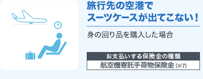 - (※5)携行品の盗難、強盗、航空会社等に預けた手荷物の不着による損害については、保険期間を通じて30万円がお支払いの限度となる場合があります(保険金額30万円超の場合)。