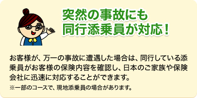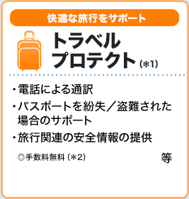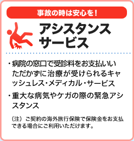 - ※各種サービスのご利用方法、サービス内容の詳細につきましては、ご旅行時にご携帯いただく「海外旅行保険あんしんガイドブック」および東京海上日動Webサイトをご参照ください。