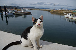 真鍋島は、人口より猫が多い「猫の島」としても知られています。真鍋島には2つの港があり、フェリーの主な発着地で人の往来が多い本浦港では、人懐こい猫たちがお出迎え。人通りが少ない岩坪港周辺では、ちょっぴり人見知りの猫たちと出会うことができますよ。