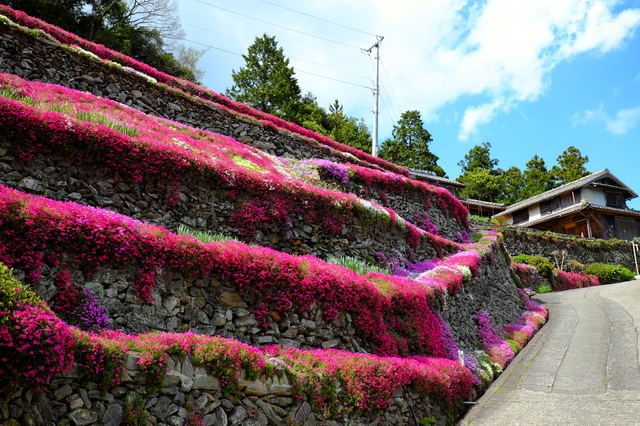 石積みは江戸時代のころに築造されたもの。高平は急峻な土地で、そこに農地を開いて家を構えていました。そのため、段々畑や家を守るために石積みが発達していったのです。現在、美しい石積みは文化・歴史の象徴として住民の誇りとなっています。そんな高開の石積みは、芝桜の名所としても知られています。春になると、石積みの棚田に植えられた芝桜が一斉に花を咲かせ、県外からの訪問客も多いんだそうですよ。また、例年12月にはライトアップも開催されています。さまざまな表情をみせてくれる高開へ、ぜひ季節をかえて出かけてみてはいかがでしょうか。