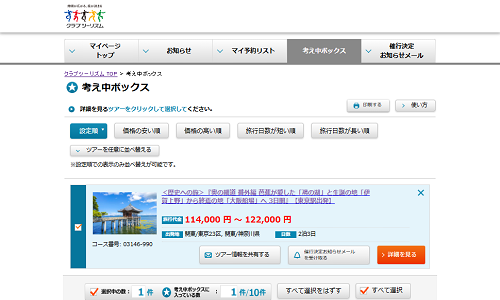 気になるツアーがあれば「考え中ボックス」へ!最大10件のツアーを一時的に保存できて内容や価格を簡単に比較できます!