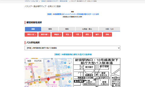 クラブツーリズムのWEBサイトはバスツアー集合場所マップをご用意しています。お住まいのエリアを選択してご自宅からお近くの集合場所を検索してみましょう。お近くの集合場所から出発するバスツアーも簡単に検索できます!