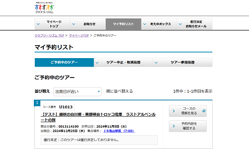 マイページのマイ予約リストから、現在の予約状況、催行状況の確認もラクラクできます!