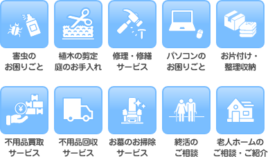 お庭のちょっとした草むしりや庭木の剪定やお庭の片づけ、家具の移動・電球交換など、日常生活のお困りごとをサポートする【お助けマンサービス(軽作業サービス)】をご用意しております。