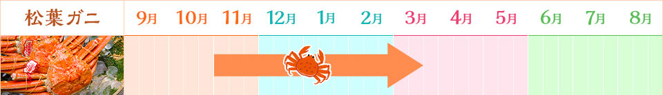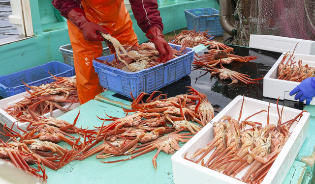 とっとり松葉ガニは鳥取県の境港、賀露港、網代港で水揚げされ、甲羅が11㎝以上のものにタグを付けて出荷されます。また、島根県独自の「カニかご漁業」によって漁獲された松葉ガニは隠岐松葉ガニと呼ばれ、青色のタグが付けられています。