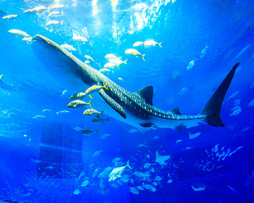 美しい海はビーチだけじゃない!「古宇利大橋」など海上ドライブや「万座毛」などの景勝地から覗く深い海も見どころ。「沖縄美ら海水族館」では沖縄の美しい海を泳ぐ生き物たちに出会えます!