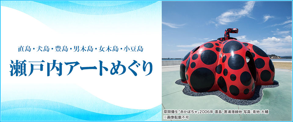 Club Tourism 's Setouchi Art Tours and Travel Special! We also offer many tours with tour guides. You can efficiently tour the art of Naoshima, where the Setouchi Triennale is held and Yayoi Kusama's "Red Pumpkin," as well as Inujima, Teshima, Ogijima, Megijima, and Shodoshima. Tours can be easily searched and booked.