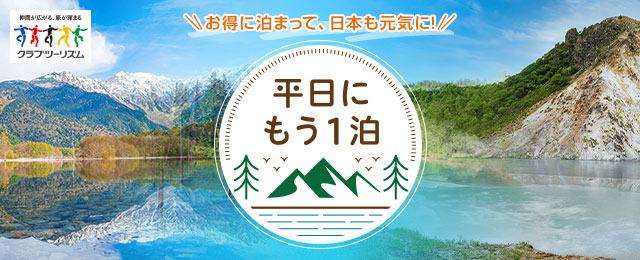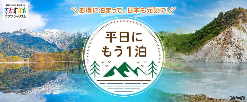 クラブツーリズムの「平日にもう1泊」キャンペーン!「全国旅行支援」を旅行需要の平日への分散を推進する機会と捉え、観光関連事業者(旅行事業者、宿泊事業者、交通事情者)と連携して、観光産業の活性化及び地域活性化を図るためのキャンペーンです。