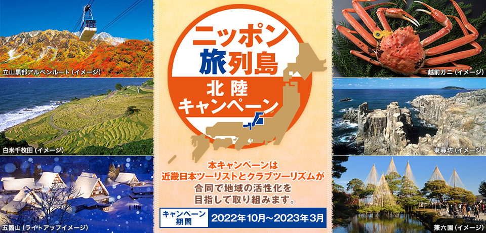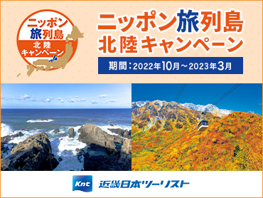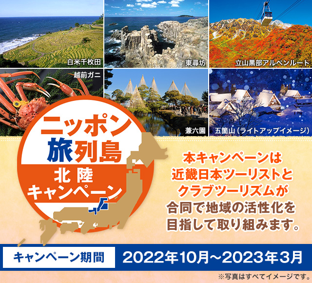 クラブツーリズムの「ニッポン旅列島~北陸キャンペーン~」!見どころいっぱいの北陸を訪れよう!クラブツーリズムと近畿日本ツーリストが合同で地域の活性化を目指して取り組むキャンペーン。クラブツーリズム特別企画など、多数ツアーをご案内。魅力あふれる日本各地を旅しよう!