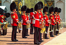 黒い熊の毛皮の帽子に、赤い服のおなじみスタイル。衛兵交代式はバッキンガム宮殿前にてご覧いただけます。