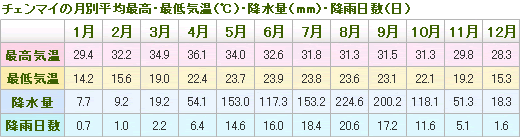 国土のほとんどが熱帯モンスーン気候に属し、1日の最高気温が30~35℃と、毎日暑さが続きます。服装は日本の夏服を準備すれば問題ありません。 チェンマイ |