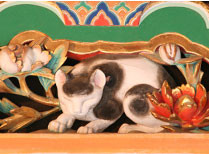 東回廊の奥社への入口頭上に「眠り猫」の彫刻があります。見る位置によってネコの表情が異なり、正面から見るとうたたね表情のため、平和を表し、左側から見上げるといつでも飛びかかれる姿勢に見えるため、家康公を守っているとも言われています。