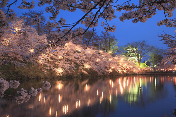 日本三大夜桜のひとつと言われる高田公園に行きました。陽が沈むと、濃紺の空にライトアップされた高田城と満開に咲き誇る桜が浮かび上がりました。お堀の水面に周囲の色彩が映り、思い描いていた幻想的な風景を写すことが出来ました。