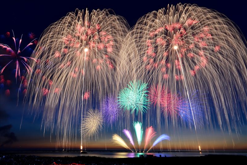 新潟三大花火のひとつ「ぎおん柏崎まつり・海の大花火大会」海中空スターマインや尺玉100発一斉打ちが有名で最近は三尺玉同時打ち上げ(撮影の花火)も人気があります。天候に恵まれイメージしていた作品が作れました。お薦めしたい花火大会のひとつです。