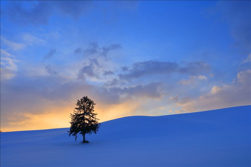 冬ごもりの雪原に屹立する1本の木立。よく見ると、樹の幹は曲がっていますが、梢はまっすぐ天空に伸びようとしているのがわかります。厳しい自然環境を生き抜く生命のたくましさに、驚かずにはいられません。天地左右の配分が的確な構図もさることながら、日が昇る直前の時間帯を狙った構想力が、この作品を成功に導いた一番の要因と思われます。(平嶋先生)