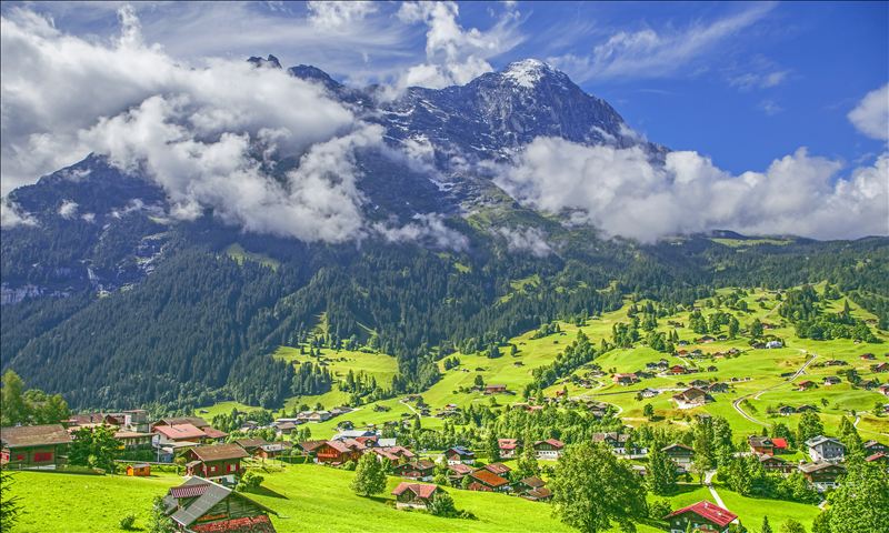 以前、山登りをしていたことから、各地で山を撮ってきましたが、私にとってスイスの山は格別に感じられました。グリンデルワルトの牧歌的な村の風景と山に残る雪や岩の表情が何とも言えず印象的で、心を動かされて撮影した一枚です。