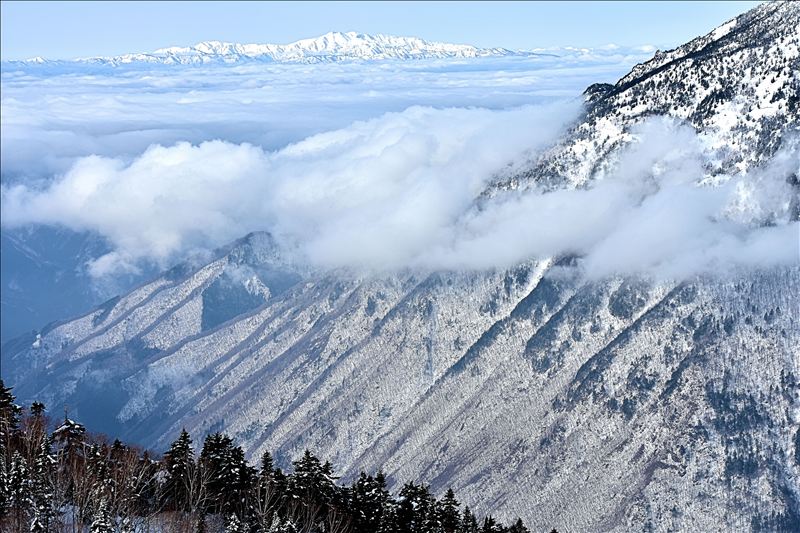 2階建てゴンドラのロープウェイで以前から行きたいと思っていた穂高へ。着いてみると、冬には珍しいほどの好天に恵まれて、遠くのアルプスの山並みまで見渡せ、感動してシャッターを切りどおしでした。作品は中でも気に入った写真です。
