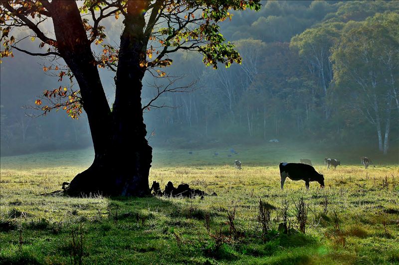 朝の陽光をうけて、放牧された牛が「ゆったり」と草を食んでいます。左の大木のシルエットが画面に立体感をあたえ、紅葉する枝がさりげなく季節感を表しています。逆光の撮影ですが、朝霧に濡れた草原の雰囲気もいいですね。背景の森は白樺林でしょうか。照葉樹林を切り開いた牧場とみられますが、思わず訪れてみたくなる旅心を誘われる作品です。(平嶋先生)