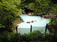 濁り湯で湯花が浮かび、温度により白濁色から乳緑色に色が変化する温泉。冬は雪見風呂も楽しい。