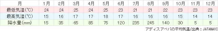 エチオピアは標高1000メートル~2400メートルの高地に位置しているため、日中は気温が上がりますが、朝晩は冷え込みます。高山病に対する心配はございませんが、水分を多めに取るように心がけましょう。