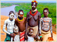 エチオピアの南部を流れるオモ川流域には多くの少数民族が生活しています。体に白く模様をつけ、ヘアバンドに鳥の羽の飾っているカロ族や、唇にお皿をはめ込んだ女性が魅力的なムルシ族など、伝統的な生活を送っている民族に出会うことができます。