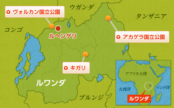 火山群、平原、沼地が広がり異なる表情を見せ、「千の丘の国」と呼ばれるように美しい丘陵地帯の広がるルワンダは東アフリカに位置します。野生のマウンテンゴリラやゴールデンモンキーが生息するヴォルカン国立公園はウガンダとの国境、ルワンダ北部にあります。