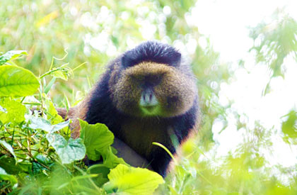 またヴォルカン国立公園にはブルーモンキーの亜種である「ゴールデンモンキー」の群れが生息しております。ゴリラウォーキングサファリと同じように歩いて探しに出かけます。ゴールデンモンキーは主に竹やぶに生息しているためウォーキングサファリは、標高差も無く容易に遭遇できます。竹やぶの中を飛び回る、お茶目なゴールデンモンキーとの遭遇はマウンテンゴリラとは違った親近感を覚えるでしょう。