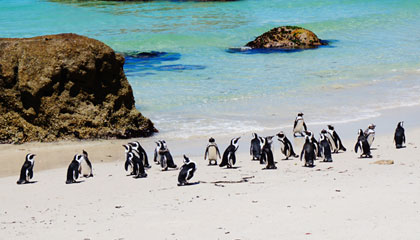サイモンズタウンの海岸線に広がるボルダーズビーチは、体長60cmほどのアフリカンペンギンの住処です。ビーチに向かって作られた遊歩道から可愛らしいペンギンたちの姿を観察することができます。