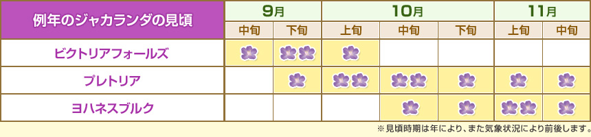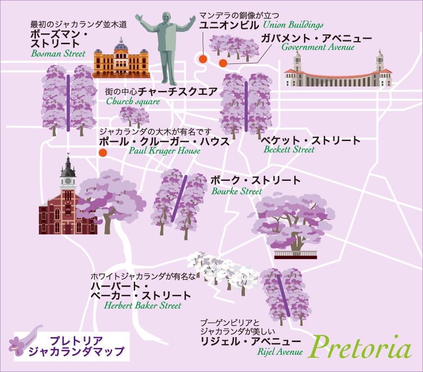 プレトリアでのジャカランダの見頃時期が終わりかけている場合は、上記プレトリアマップ記載の観賞スポットはご案内せず、ヨハネスブルグのジャカランダ観光のお時間が中心になる場合がございます。